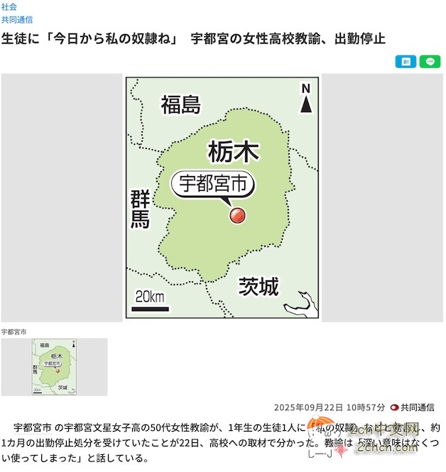 【日本栃木县】宇都宫市一名50多岁高中女教师因对学生说“从今天起你就是我的奴隶”而被停职