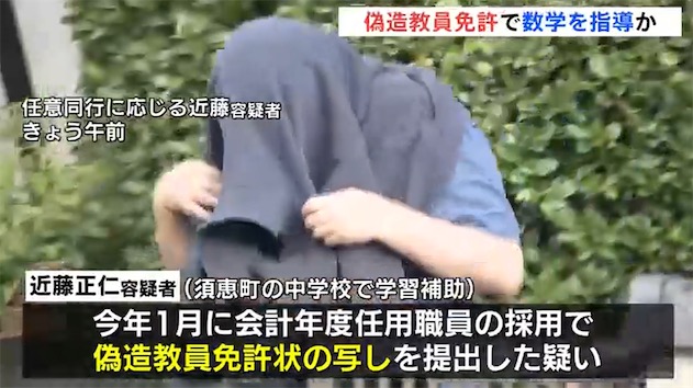须町一所初中的助教近藤正仁,涉嫌在今年1月招录年度聘用人员时提交了伪造的教师执照副本。