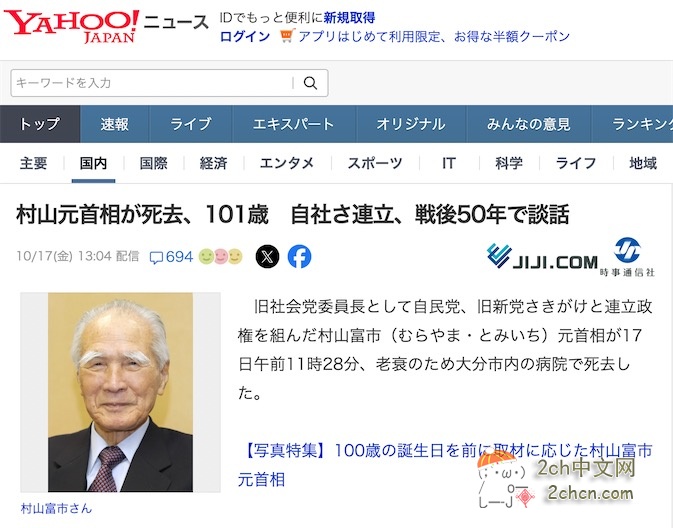 2ch:【讣告】日本前首相村山富市逝世,享年101岁