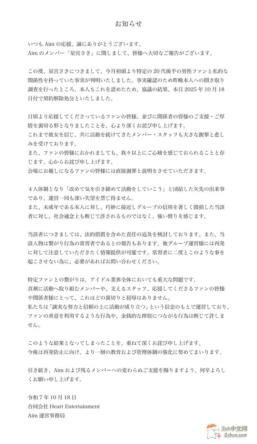 官方账号发布声明称:“我们很遗憾地通知大家,关于星宫咲的私下交往问题,我们有一个声明。” 声明称“我们得知星宫咲自本月初以来,与一名20多岁的特定男粉丝私下交往。” 关于事件详情,声明称,“我们昨晚对星宫咲进行了询问,她本人也承认了事实。” “经过慎重考虑,我们决定自今天,即2025年10月18日起解除合约。”