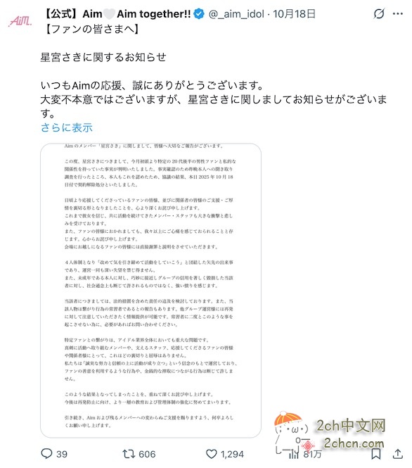 女性アイドルグループ・Aim(えいむ)が18日、公式X(旧ツイッター)アカウントを更新。メンバーの星宮さきが「特定の男性ファンと私的な関係性を持っていた」として、即日での契約解除を通告した。