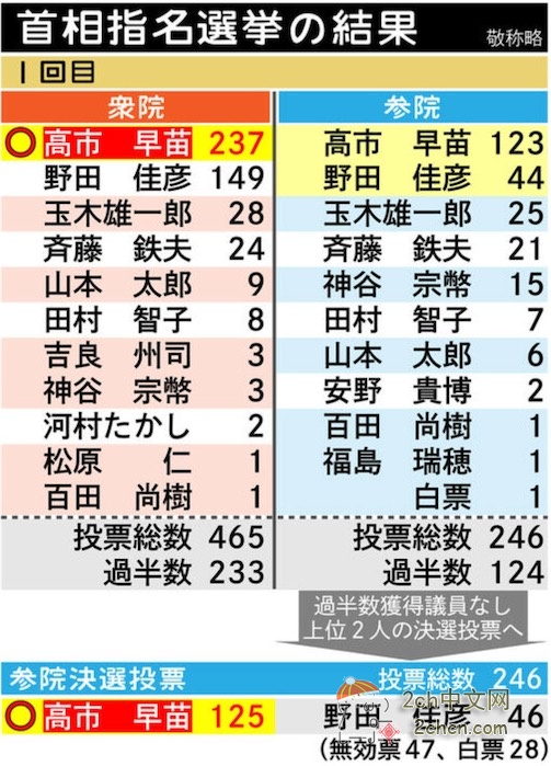 在此次投票中,同意组建联合政府的自民党、日本维新会和部分少数派投票支持高市早苗,使其获得过半数票。这是日本宪政史上首次由女性担任首相。