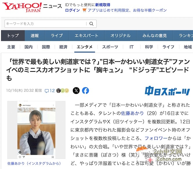 10月16日,被一些媒体誉为“日本最可爱的剑道少女”的艺人佐藤あかり(29岁),多次更新自己的Instagram和Twitter账号。12日,她上传了在东京举行的写真拍摄等粉丝活动幕后花絮照,粉丝们纷纷表示“好可爱”。
