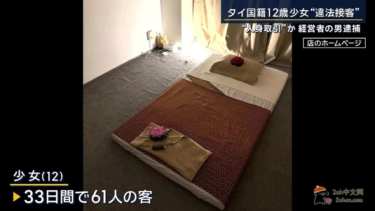 据日本电视台11月6日报道,因雇用一名12岁的泰国女孩在该按摩店工作,东京一家私人按摩店的老板和另外一人被捕。该女孩被以“人口贩卖”为目的带到日本。近年来,日本的“人口贩卖”受害者人数不断增加。