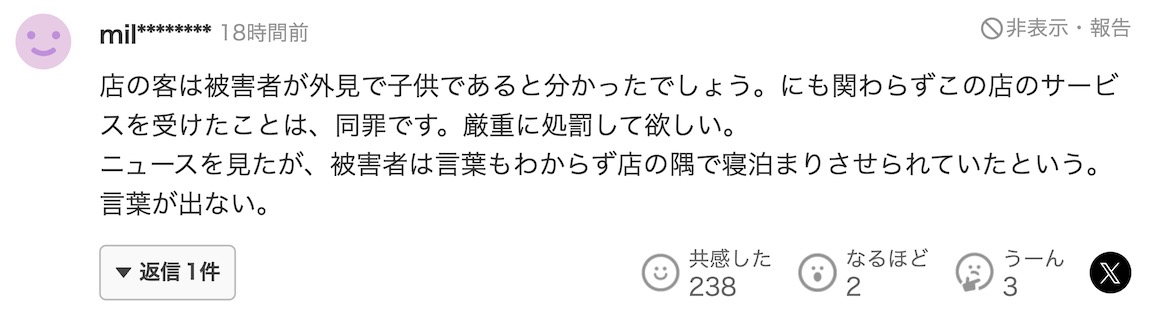 这家店的顾客从受害者的外貌就能看出她还是个孩子。尽管如此,他们仍然接受了这家店的服务,应该判处同罪。我希望他们受到严惩。