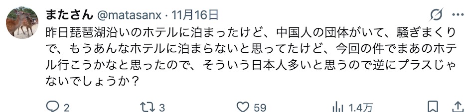 我昨天住在琵琶湖边的一家酒店,里面有中国跟团游客,他们特别吵闹。我本来以为以后再也不会住这种酒店了,但这次之后,我也许会再去试试那家酒店。我觉得很多日本人都这样,所以也许这反而是件好事?