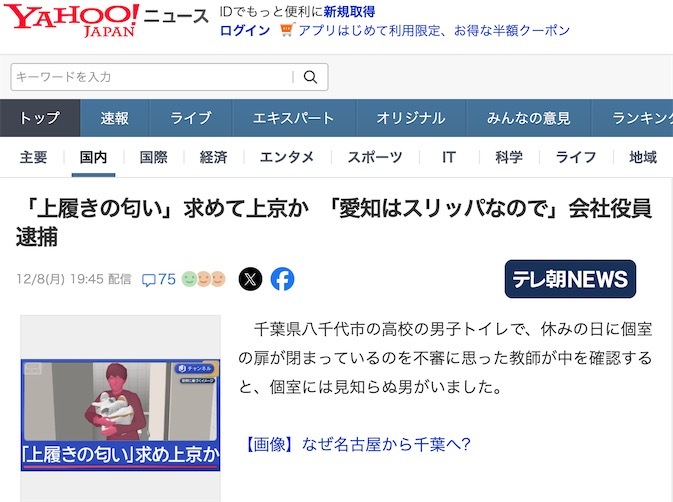 12月6日,日本千叶县八千代市一名男厕所的老师在休息日发现厕所门关着,起了疑心。他进去查看,发现里面有一名陌生男子,手里还抱着5双女学生室内鞋,于是该男子被当场抓获。