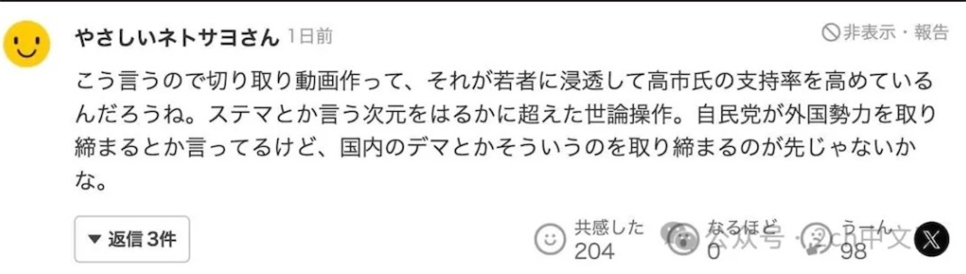 估计职位发布者制作这类视频,是为了渗透日本年轻人,提升高市的支持率吧。这是远超“秘密营销”的彻头彻尾的舆论操纵。自民党口口声声要打击外国势力,但我认为他们应该先从打击日本国内的谣言开始。
