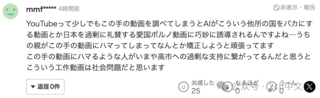 如果你在YouTube上搜索这类视频,人工智能会巧妙地引导你观看嘲讽他国的视频,或是过度吹捧日本的“爱国涩情片”……我的父母沉迷于这类视频不可自拔,我正在努力纠正他们。