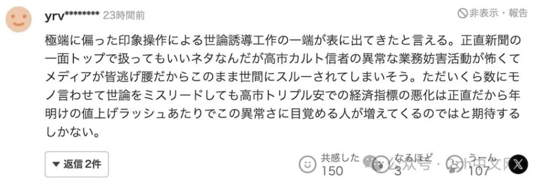 这是利用极端偏颇的手段操纵舆论的典型案例。说实话,这事本来完全可以登上报纸头版,但日本的媒体却都消极对待,因为害怕高市的狂热追随者会扰乱正常的业务,因此很可能就这样被公众忽视。然而,无论他们如何利用数据误导舆论,高市的“股、债、汇三杀”所导致的经济指标恶化都是事实,只能寄希望于新年物价上涨的浪潮能够让更多人察觉到这种异常。