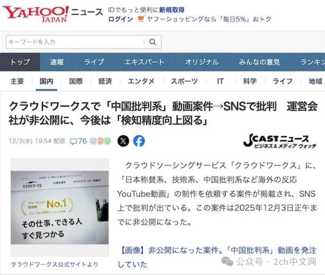 据日本媒体J-cast12月3日报道,一个要求制作“赞扬日本、技术以及批评中国等内容的外国人看法系列YouTube视频”的项目出现在CrowdWorks上,在社交媒体上引发了批评。