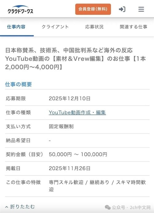 该职位发布于11月26日。发布者委托制作赞扬日本、批评中国的YouTube视频,每个视频报酬为2000至4000日元。工作详情如下: