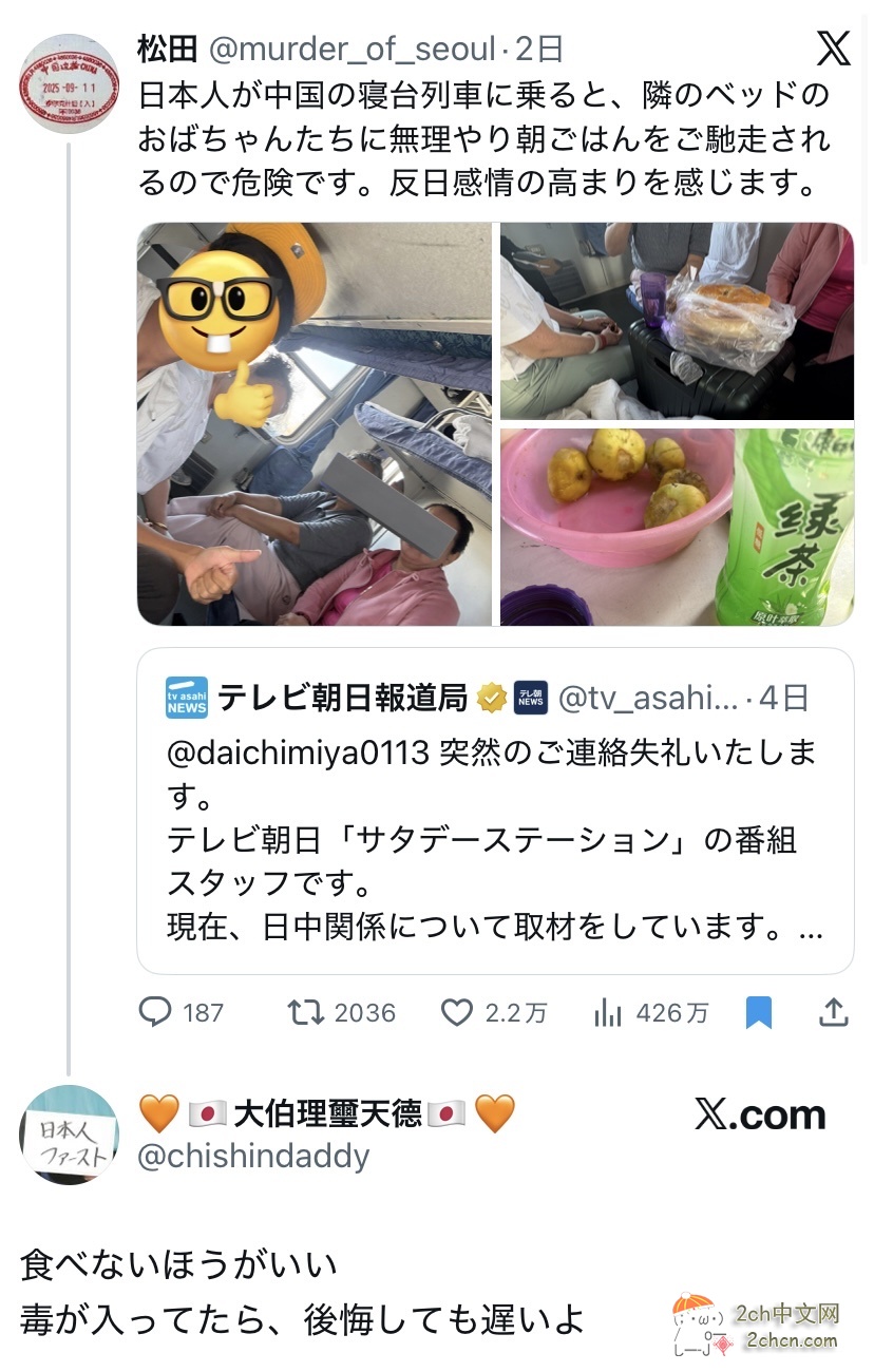 还有一名叫松田的日本人表示,“当日本人在中国乘坐卧铺列车时,会被邻床的女士强迫吃早餐,这真是太危险了。我觉得反日情绪正在抬头”。