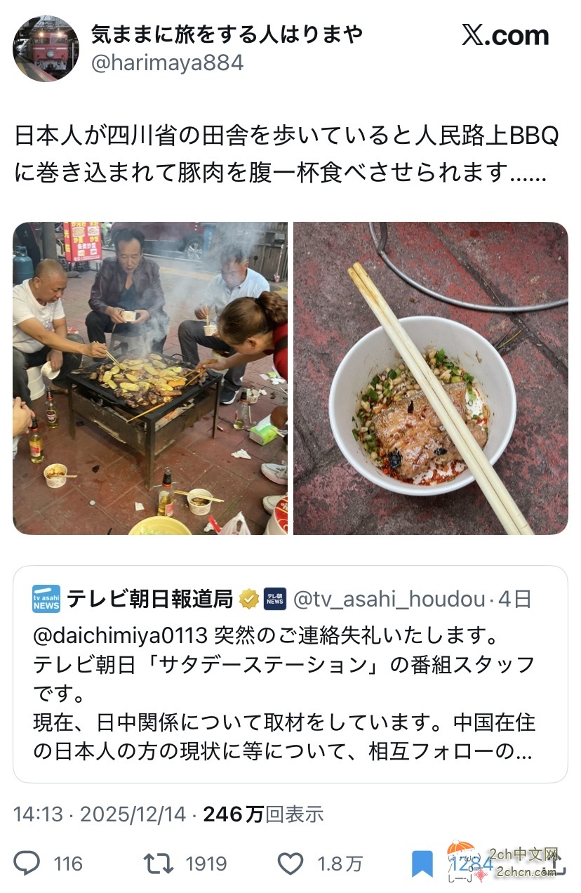 在中日关系紧张之际,12月11日,日本朝日电视台报道局在X上发推文@一名在中国上海的日本美容师宫本大地,称正在报道日中关系,想了解关于在华日本人现状的问题。