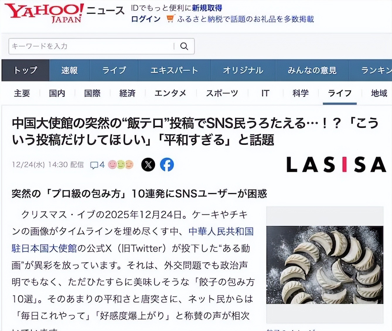 12月23日下午,平时一脸严肃地发布外交和政治声明的中国驻日本大使馆X账号,突然发布了一段“饺子的10种包法”的视频,引发了日本网民的关注,日本媒体对此进行了报道。