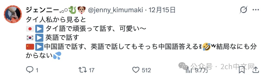 从我这个泰国人看来:日本人会努力说泰语,可爱。韩国人会说英语。中国人会说中文,即使我说英语,对方也会用中文回答。最终完全无法沟通。