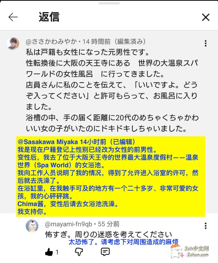 1月3日,一位自称“前男性”的网友在一位YouTube博主发布的视频评论区分享了他在温泉泡澡的经历。虽然目前尚不清楚这位网友是否真的做过变性手术,但他的评论,包括温泉设施的具体名称、他解释自己是在获得许可后进入女浴池,以及他对浴缸里那位女性外貌的描述,都在网上引起了轩然大波,有人评论“真恶心”、“他居然会对女性产生性欲,这本身就是个问题”、“这人如果不是男人,那他到底是什么?” “允许他进入的场所也是同谋”,“我再也不会去了”,“这是犯罪。即使你改变了法律身份,男人也不能进入女浴池。”许多人要求该场所做出解释。