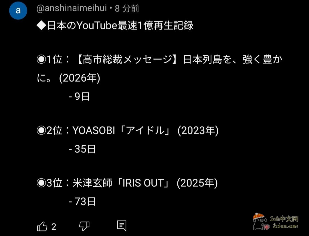 2ch:高市的Youtube视频播放量超过1亿次😆