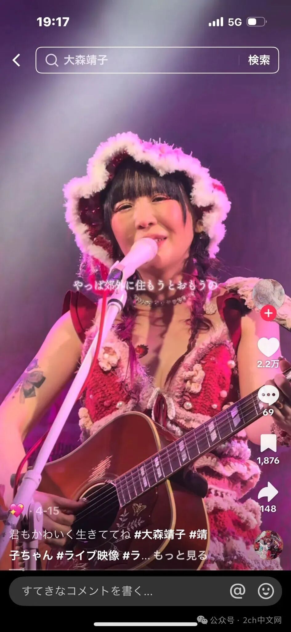 大森靖子出生于1987年,现在已经38岁,是日本女性创作歌手。她于2014年3月14日正式出道。自称为“超歌手”并被誉为“激情派”歌手,风格是自弹自唱。