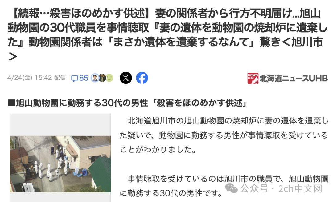 据日本HBC 4月24日报道,日本北海道旭川市的30多岁职员,因涉嫌将妻子的尸体丢弃在北海道旭川市旭山动物园的焚化炉内,正在接受警方的讯问。